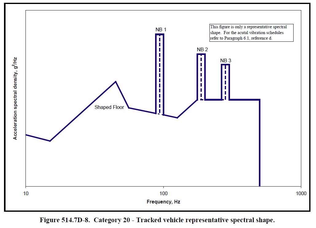 Random-on-Random (RoR) vibration testing has narrow band random peaks that are superimposed on a low level of broadband random vibration. Typical applications that contain RoR vibration are tracked vehicles such as tanks or a truck changing speed while driving over a rough road. For example, the pitch of the tracks produces rhythmic random vibration peaks at specific frequencies versus speed of the vehicle. Figure 2 shows a typical tracked vehicle vibration test profile from MIL-STD-810G.