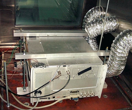 When performing HALT, it is desired to change the temperature of internal components as fast as possible. If products have existing vent holes or cooling fans, then air ducts can be placed to blow air through them as seen in Figure 2. Products with a sealed enclosure or case should be modified whenever possible to allow for internal airflow. This can be done by removing covers when practical or drilling holes in the enclosure. Air ducts can then be placed near these openings to direct air flow internally into the product.