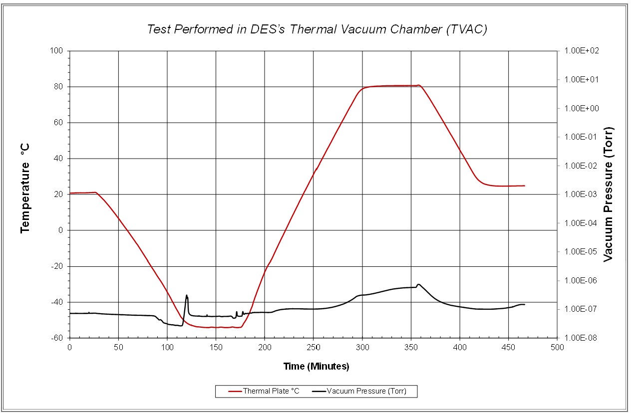 DES has the experience and accredited lab to perform validation of mission-critical components during Prototyping, Design Verification, and Qualification phases. DES’s TVAC can achieve high vacuum levels and apply extreme temperatures simultaneously with high vacuums. DES can also simulate the severe vibrations and pyroshocks that occur during a launch.